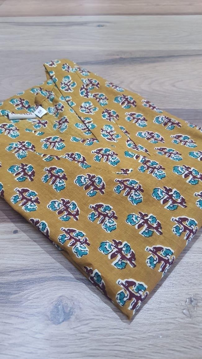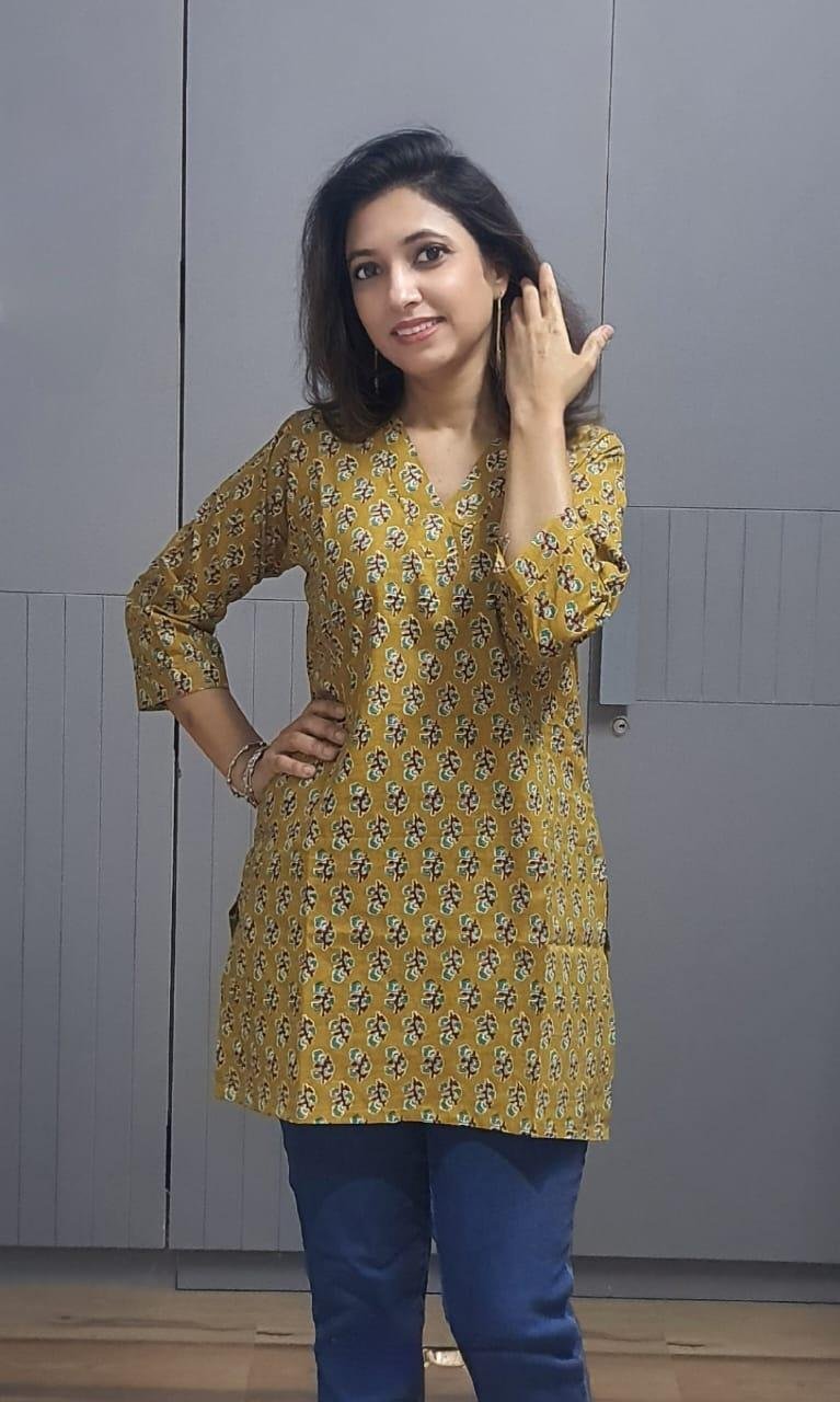 This tunic is made of pure cotton cambric fabric which gives excellent look. It has 3/4th sleeves with side slit. It has V neck patti pattern.