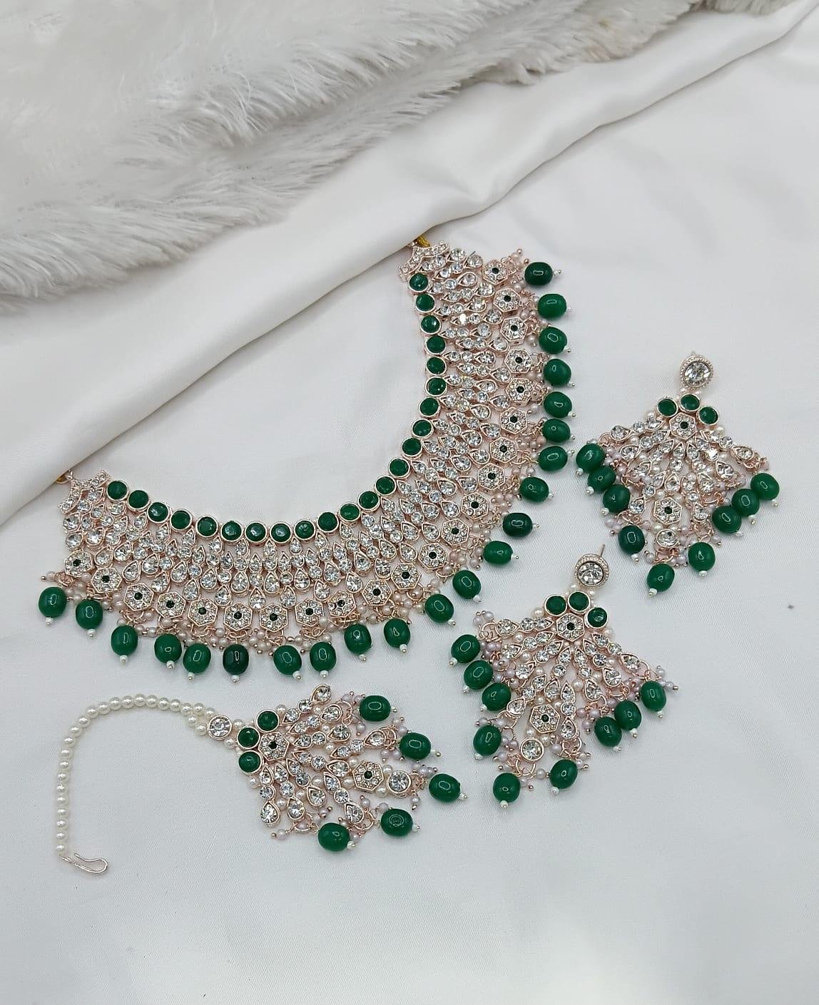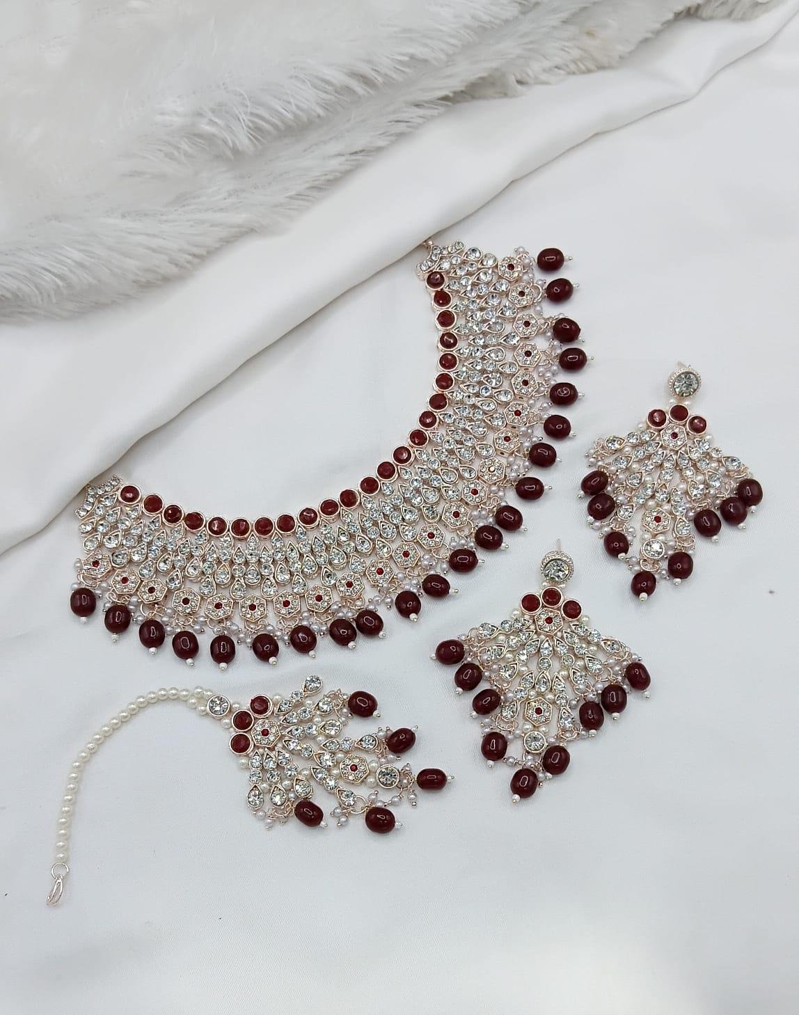 The set includes a choker-style necklace, a pair of matching dangle earrings, and a maangtika (forehead ornament).