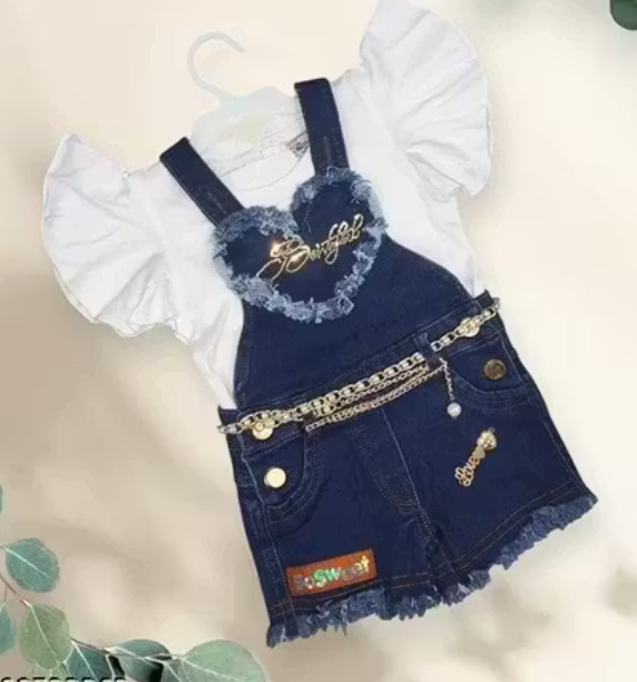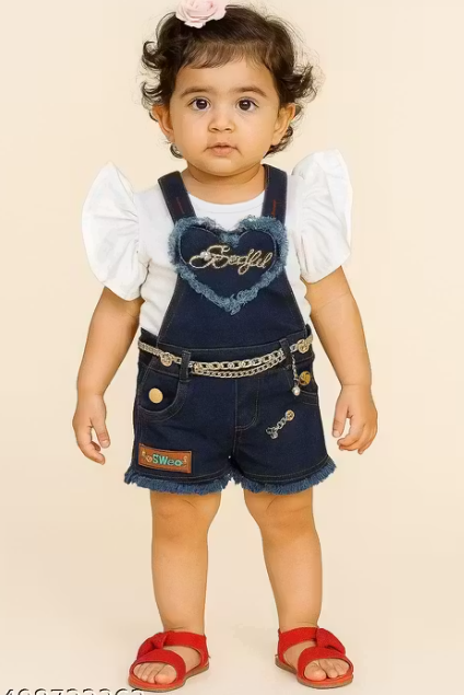 Stylish Baby Girls Denim Dungaree Set with White Puff Sleeve Top