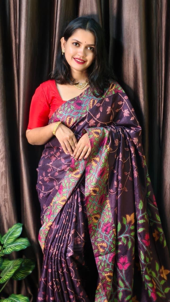 - Deep wine / maroon base with multicolour floral prints—mainly yellow, green, blue, and pink—paired with a red blouse.