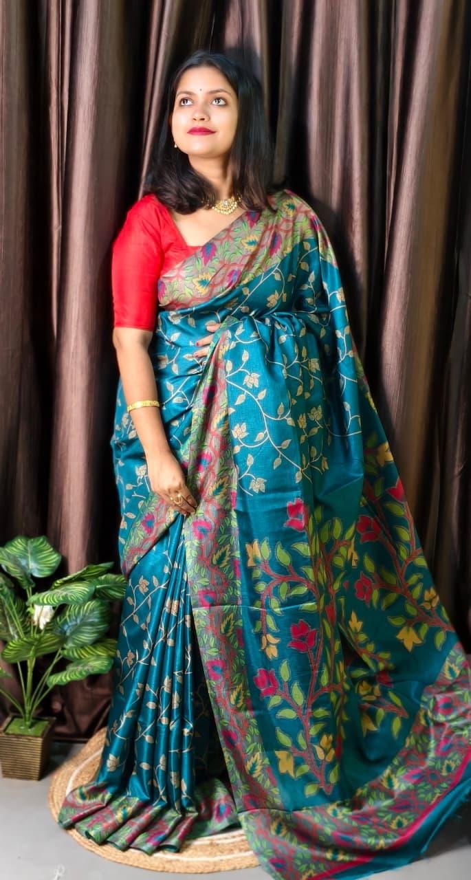- Teal blue (peacock blue) with a red blouse, and multicolour floral accents (shades of yellow, green, pink, and light blue) on the saree.