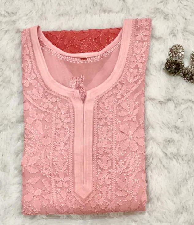 SWATI Pink Pure Viscose Chikankari Resham Omray Kurti