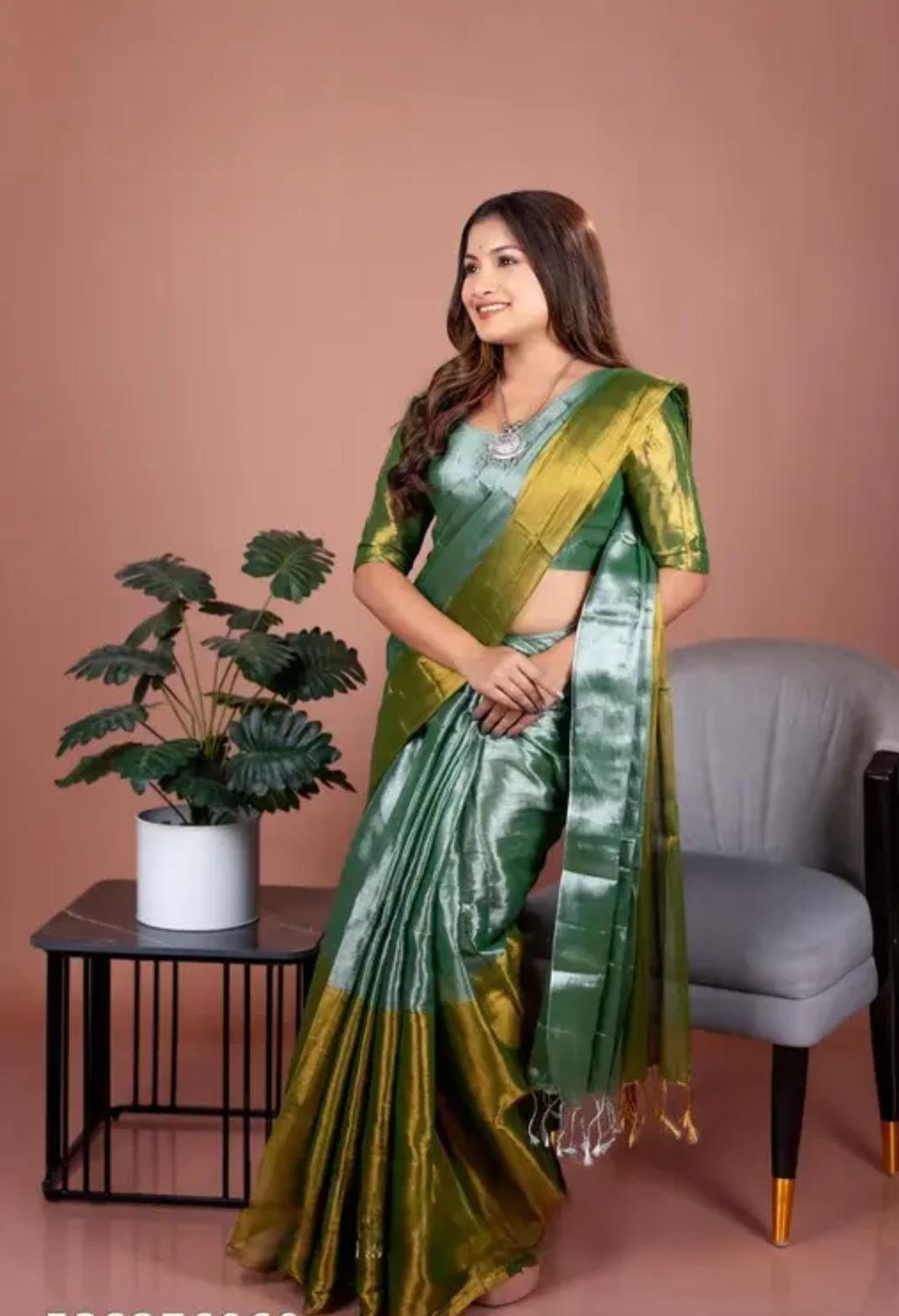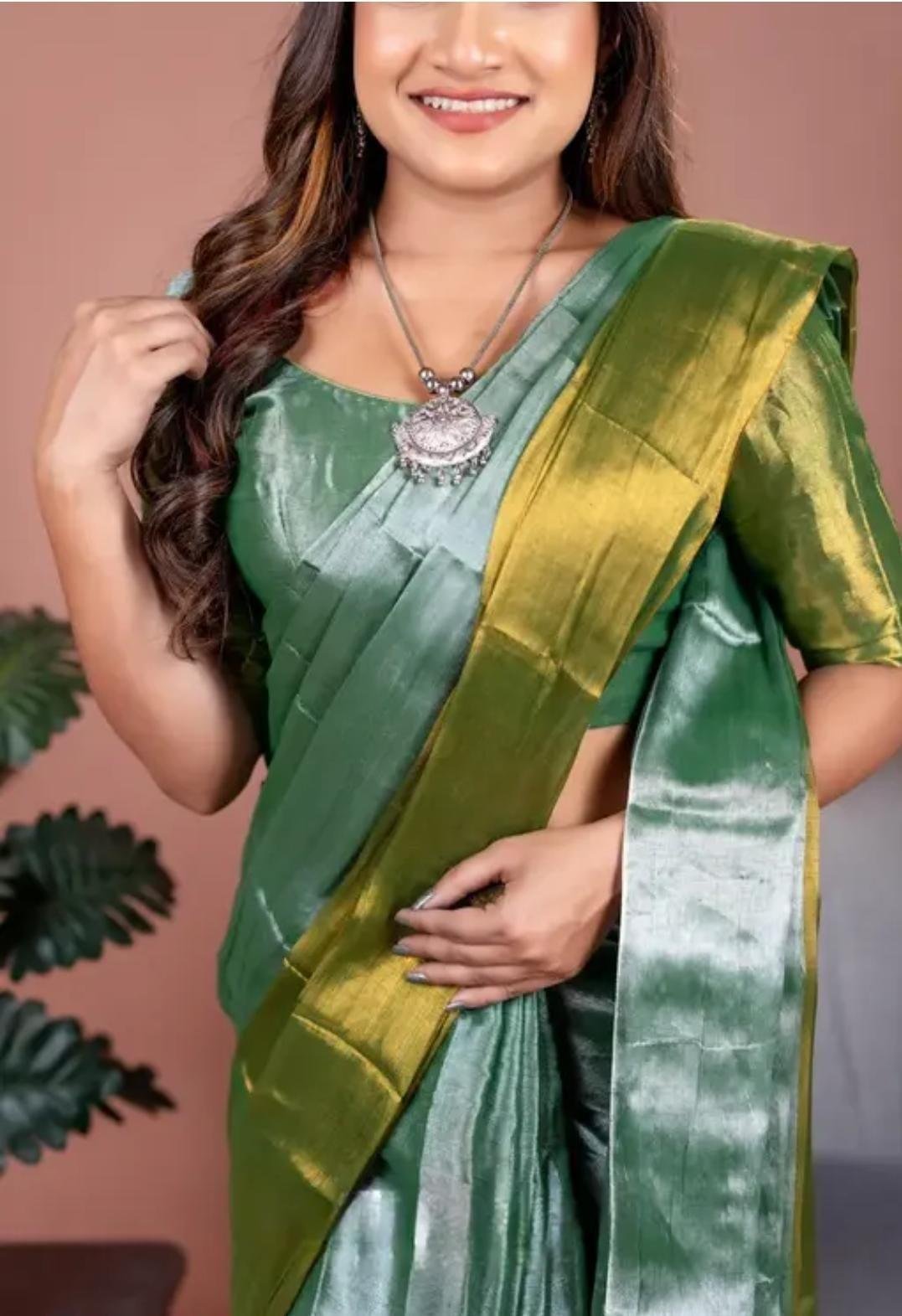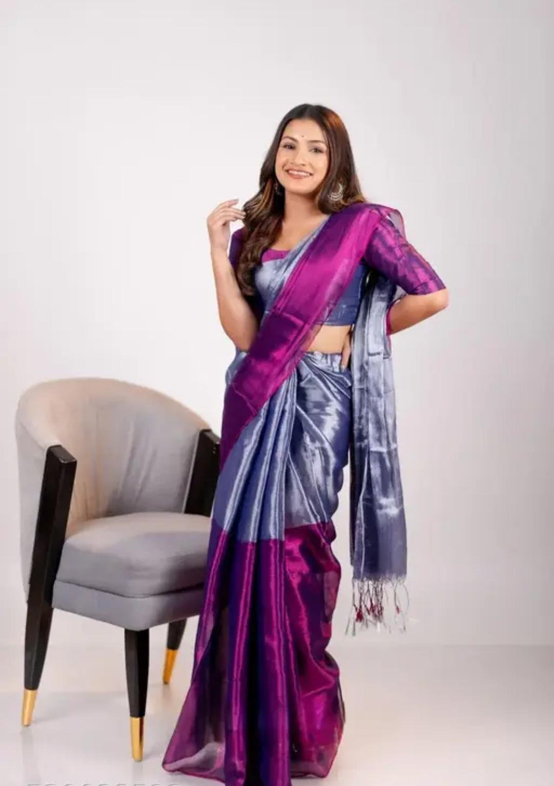 Add a touch of elegance to your ethnic collection with this stunning Tissue Saree with Blouse. Crafted from lightweight and shimmering tissue fabric, the saree features a subtle glossy finish that beautifully reflects light, giving it a graceful and luxurious appeal. The soft texture ensures a comfortable drape, making it ideal for long festive or celebratory wear.