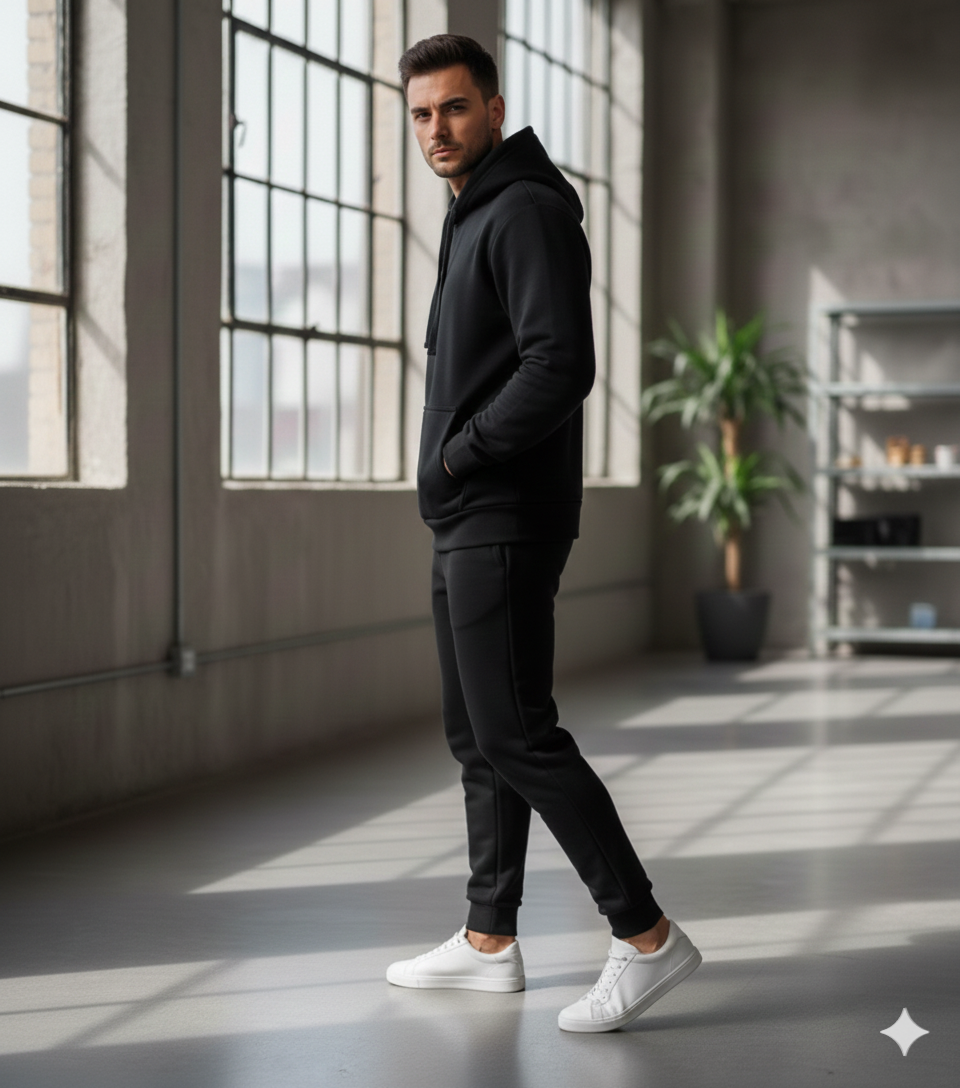 A black tracksuit is a stylish and comfortable outfit designed for both athletic activity and casual wear. It typically includes a matching jacket and pants, made from soft, breathable materials such as polyester, cotton blends, or fleece.
