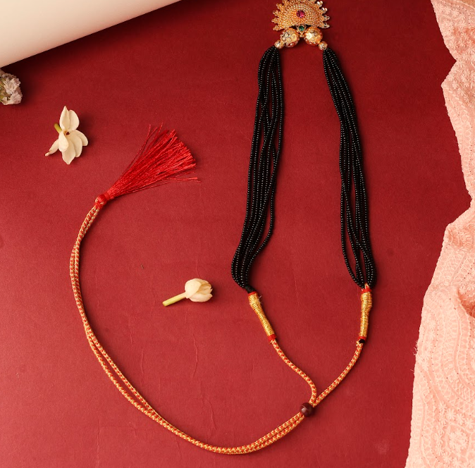 Traditional Maharashtrian Style Black Beaded Mangalsutra Necklace With Gold-Toned Pendant And Red Tassel