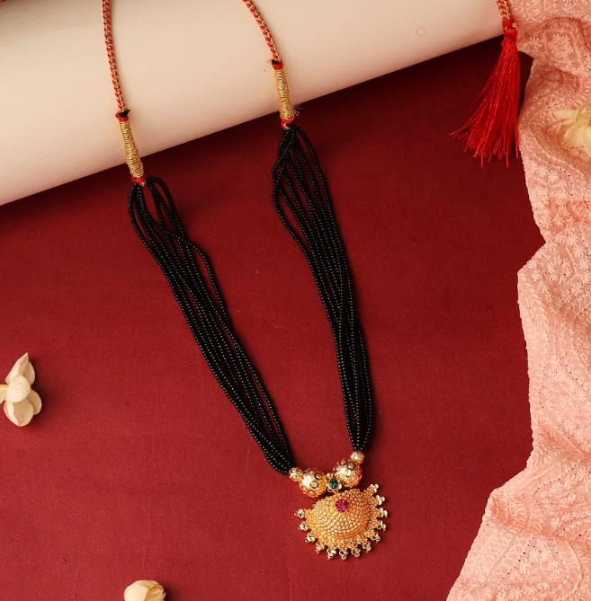 This elegant traditional mangalsutra features double strands of fine black beads, symbolizing marital commitment and protection. The necklace is highlighted by a richly detailed gold-tone pendant with intricate texture work, accented by a central red stone and small green stone embellishments for a vibrant ethnic touch. Delicate hanging gold beads at the base of the pendant add graceful movement and charm.