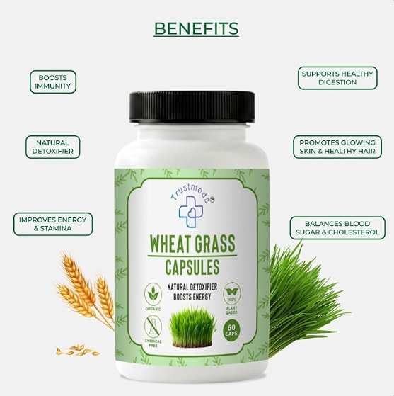 Trustmeds Pure Organic Wheat Grass Capsules 500mg (60 Veg Capsules) are the convenient way to unlock the powerful benefits of this incredible superfood. Rich in Chlorophyll, Vitamins (A, C, E), Minerals (Iron, Calcium), and Amino Acids, our capsules deliver a concentrated source of pure, natural nutrition for your daily regimen.
