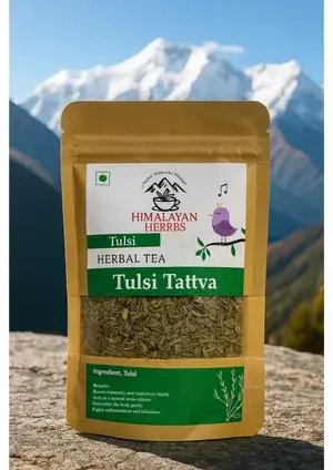 Rebalance your body and mind with Tulsi Tattva -Tulsi Herbal Tea, an authentic Ayurvedic herbal infusion by Himalayan Herrbs. Made from 100% pure Tulsi leaves (Holy Basil), this tea is a natural remedy for immunity, stress relief, detox, and respiratory health.