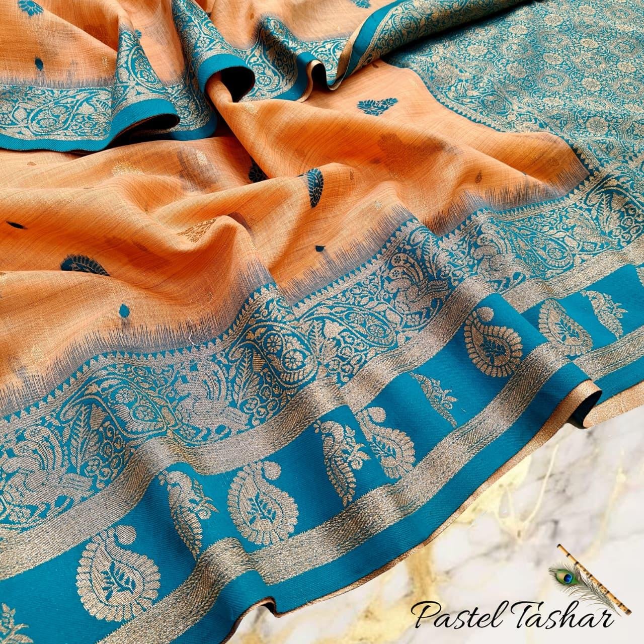 Graceful Tussar Banarasi saree crafted in soothing pastel shades, highlighted with an elegant contrast border for a refined and luxurious look. The rich Banarasi weave adds traditional charm, while the soft Tussar texture ensures comfort and a beautiful drape. Perfect for weddings, festive occasions, and special events, this saree blends classic artistry with modern pastel elegance.