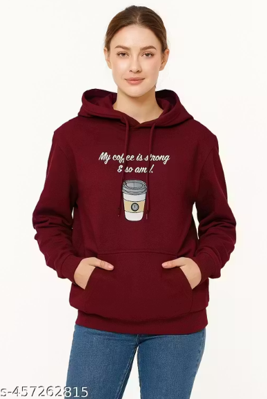 Add a stylish edge to your casual wardrobe with this Maroon Printed Hoodie for Women. Crafted from soft cotton fabric, this pullover hoodie features a trendy typography print, kangaroo pockets, and tie-up hood for a cozy yet fashionable look. The cuffed long sleeves and regular length make it perfect for daily wear, winter outings, or casual styling. Comfortable, trendy, and easy to pair with jeans or joggers.