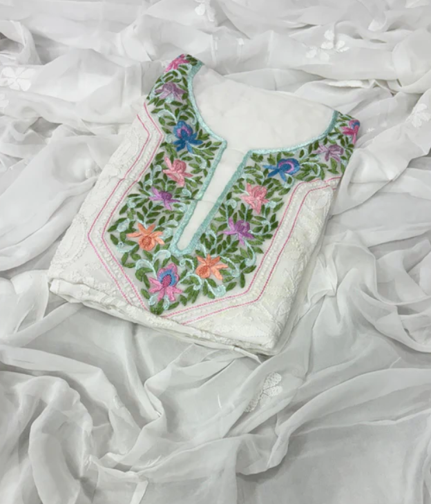 White Pure Viscose Georgette unstitched kurta piece with beautifully done premium handwork chikankari and Parsi work all over paired with a matching Pure viscose Georgette Dupatta with Chikankari handwork & Parsi work.
