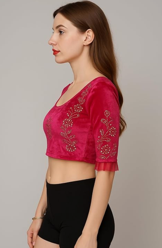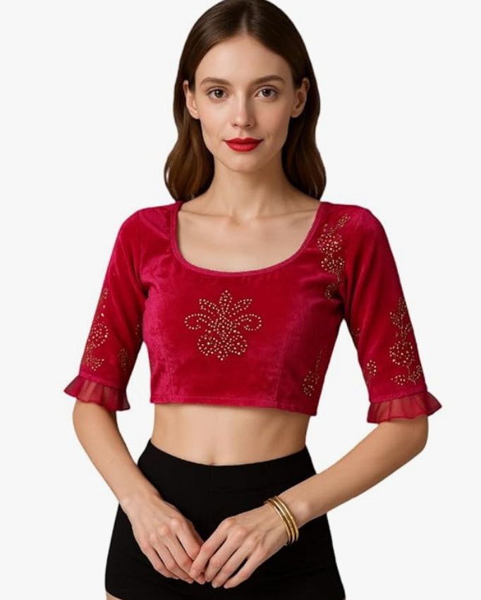 Velvet Crop Top Blouse – Gold Studded Design with Ruffle Sleeves | Readymade Ethnic Blouse for Saree, Lehenga & Festive Occasions