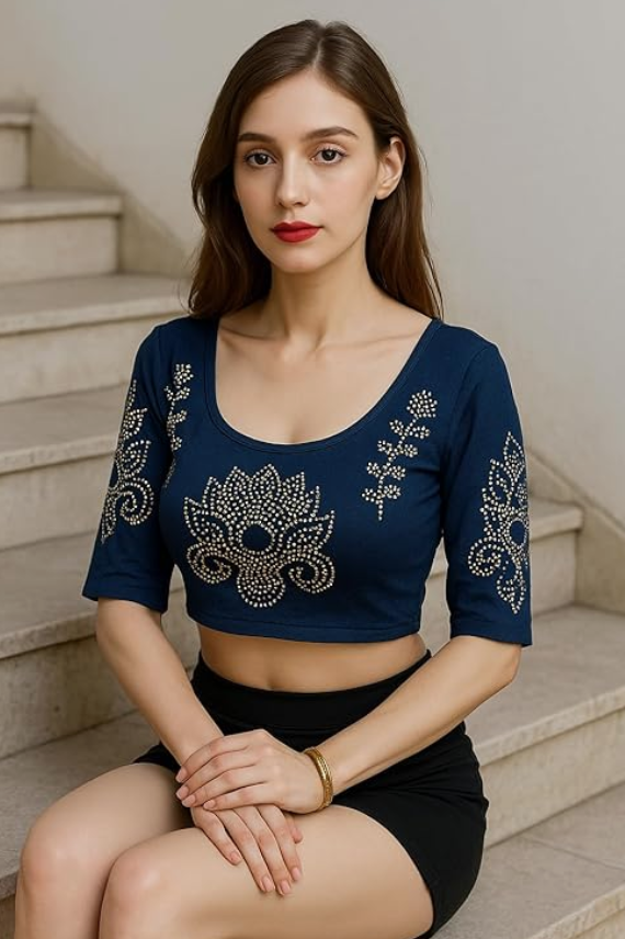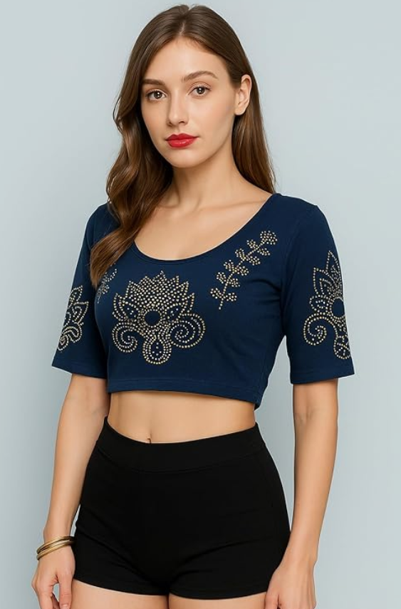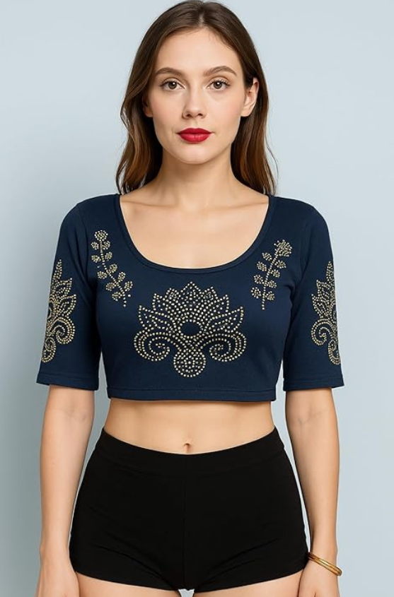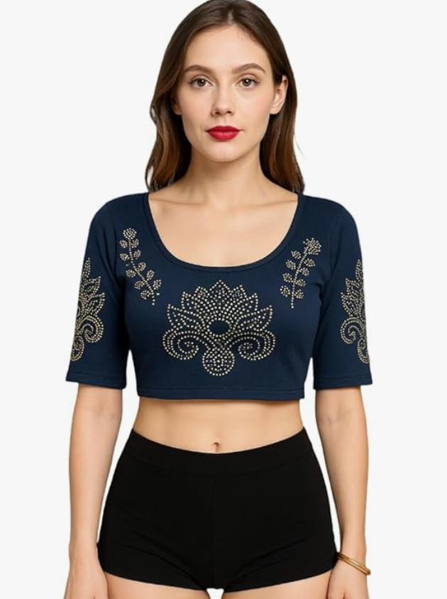 Velvet Crop Top Blouse – Gold Studded Design with Ruffle Sleeves | Readymade Ethnic Blouse for Saree, Lehenga & Festive Occasions