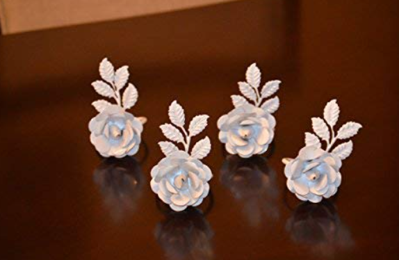 - 1.Handcrafted Luxurious Floral Napkin Rings Set of 4. White Flowers. Rose Flower with Leaves Size 4.0" Ring Size 2.0" Set of 4. Long Lasting and Reusable