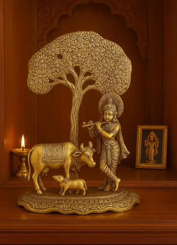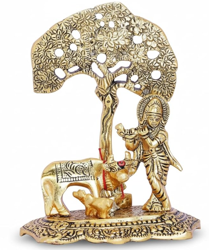 - Package Contains - 1 Cow krishna statue, Material -Aluminium, Color - Gold Oxidized, Size H x W x L- 17 Cm x 12 Cm x 8 Cm