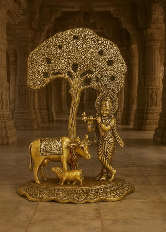 VIBHSA Home Decor & Gifts Metal Krishna with Cow Standing Under Tree Plying Flute (Gold, 12.5X8X16Cm), 1 Piece