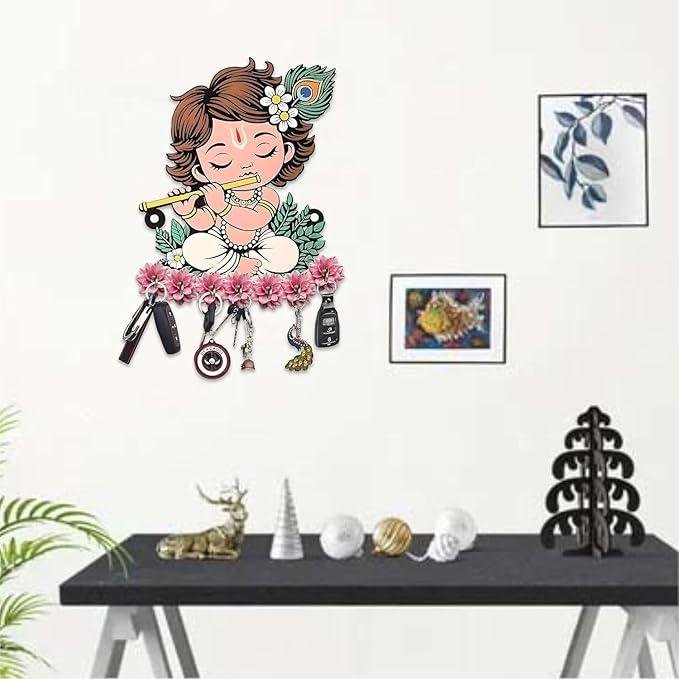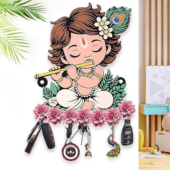 Add a touch of spirituality and elegance to your home with this beautifully crafted Baby Krishna Key Holder. Designed with vibrant colors and adorable details, this wooden key hanger features Lord Krishna playing the flute, surrounded by floral accents. It comes with 5 strong hooks to neatly organize your keys for home, office, or vehicle. This key holder not only helps keep your keys in place but also adds a divine decorative touch to your wall. Ideal for gifting on occasions like housewarming, Diwali, Janmashtami, or birthdays.
