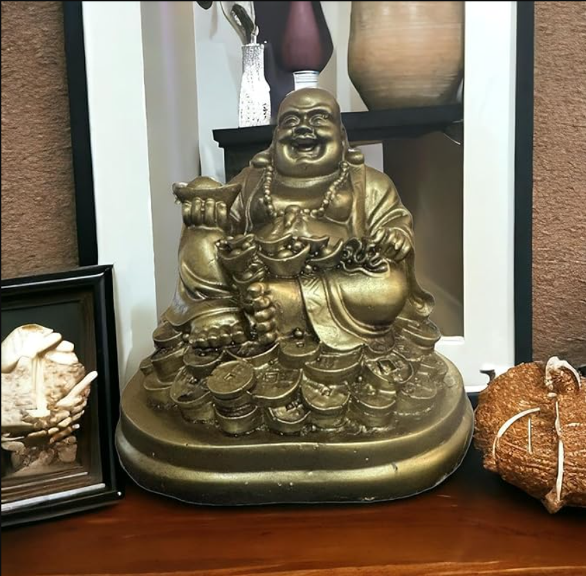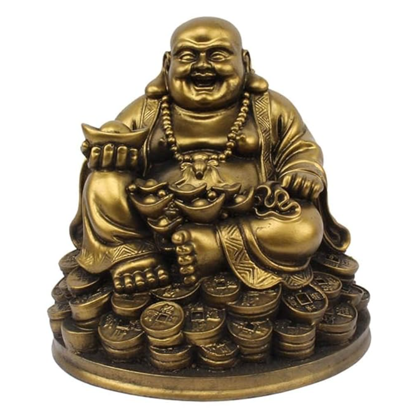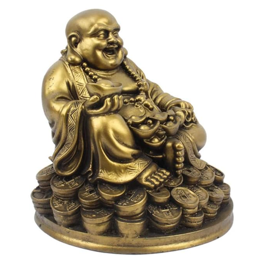 - Symbol of Prosperity: The Resin Fengshui Figurine Laughing Buddha symbolizes wealth and abundance, depicted sitting on luck money coins with a golden ingot in hand.