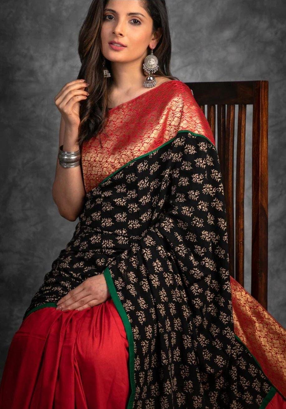 Celebrate the richness of tradition with this striking handcrafted Ajrakh saree, thoughtfully designed in a vivid palette, complete with a matching blouse piece. Made from authentic Ajrakh fabric, this free-size saree is a stunning blend of red, black, gold, and subtle green tones. The primary body features a bold red base, seamlessly transitioning into a beautifully patterned section of black and gold. Intricate traditional block prints add depth and character, while green accents and prominent gold detailing lend a festive elegance. Perfect for cultural occasions, celebrations, or artful daywear, this saree is where timeless craftsmanship meets vibrant storytelling.