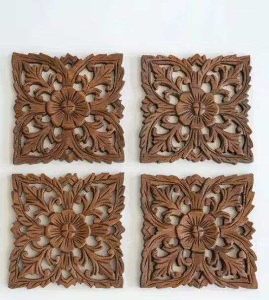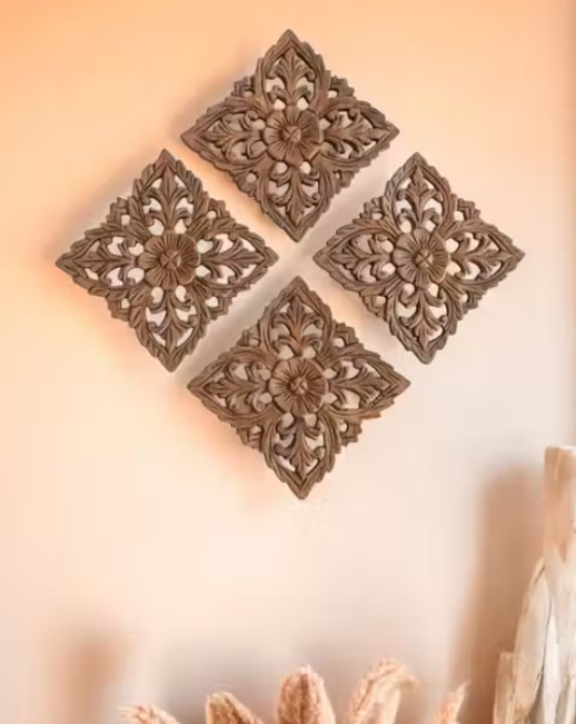 Enhance your living space with this elegant hand-carved wooden wall hanging panel set, designed to bring warmth and artistic detail to your interiors. Featuring a beautifully detailed floral and leaf motif, each square panel showcases traditional craftsmanship with intricate cut-work and a rich natural wood finish.