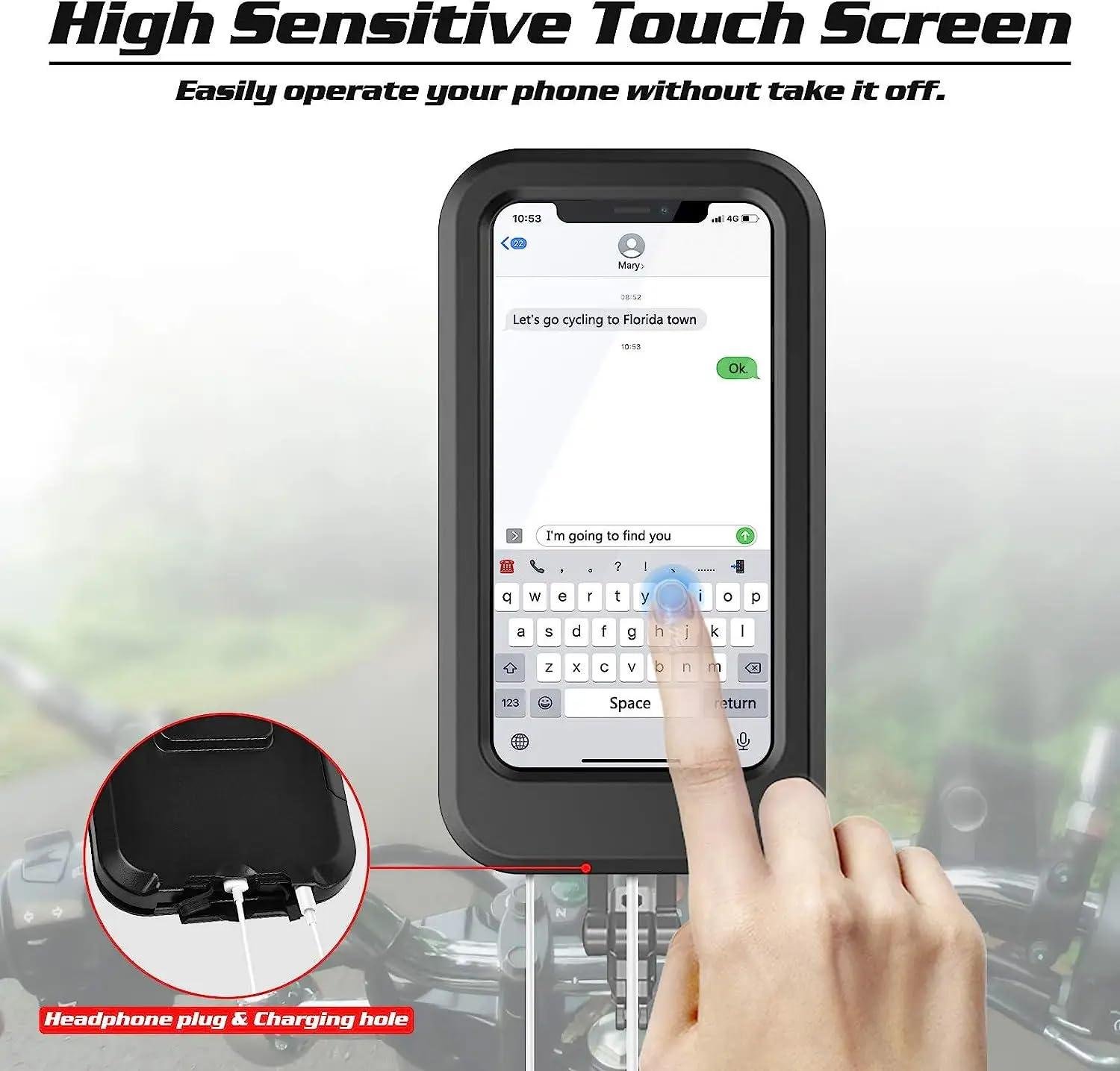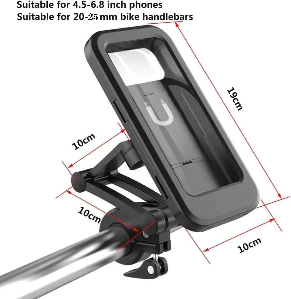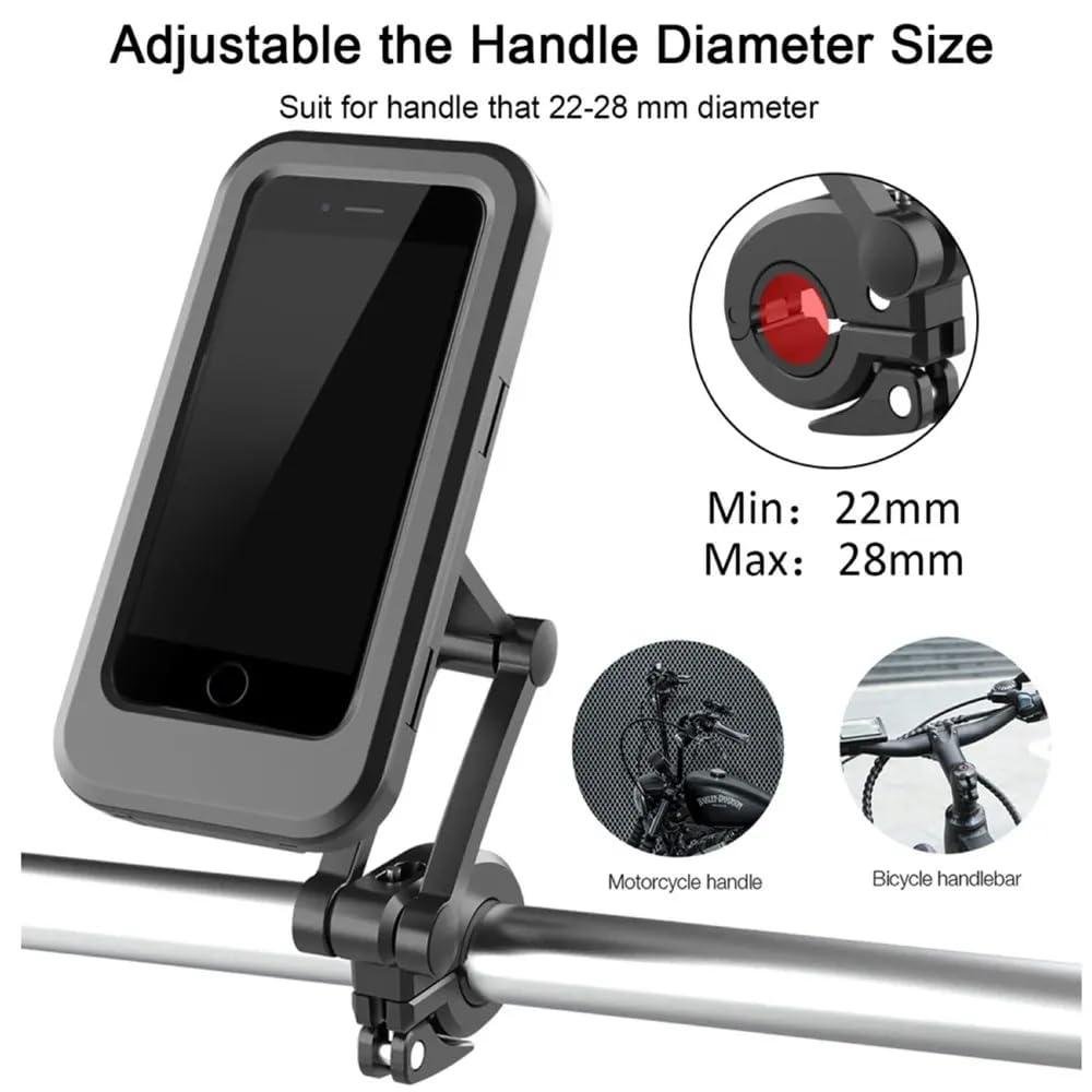 - Universal Fit for 4 7.6 Smartphones Securely holds most phones including All 14 13 12 series, and Android more perfect for cyclists, bikers delivery riders. 100% Waterproof Weather Resistant Features waterproof TPU touch screen cover, sealed zippers charging port plugensures full protection in rain, snow dust. 360 Rotatable Height Adjustable Mount Easily rotate or tilt your phone to portrait or landscape ideal for GPS navigation, music control, or hands free calls on the go. Tool Free Quick Mounting System Universal clamp fits handlebars of bikes, motorcycles, scooters, e bikes no tools needed for setup lock and release in seconds Shockproof Vibration Dampening Design Built in silicone padding and impact resistant housing protect your phone from shocks and bumps, even on rugged terrain.