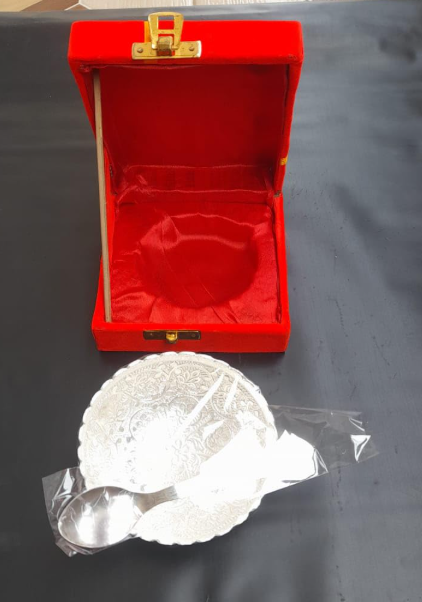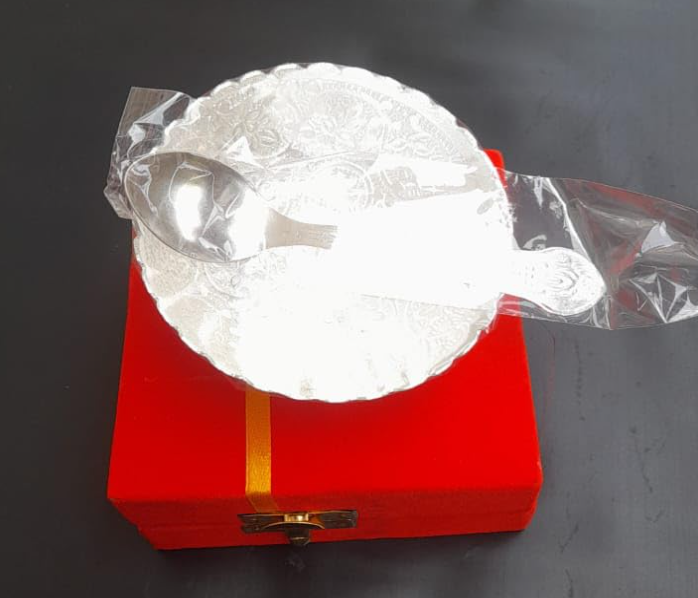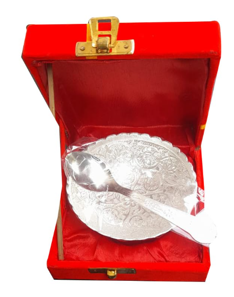 Wedding Return Gift Set with Silver Plated Bowl and Spoon in Red Velvet Box