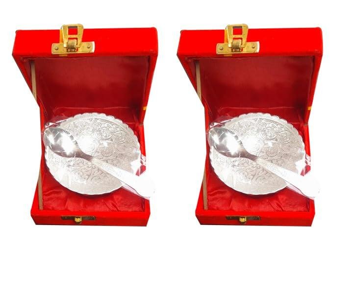 Wedding Return Gift Silver Plated Bowl with Spoon Set in Velvet Box, Pack of 2
