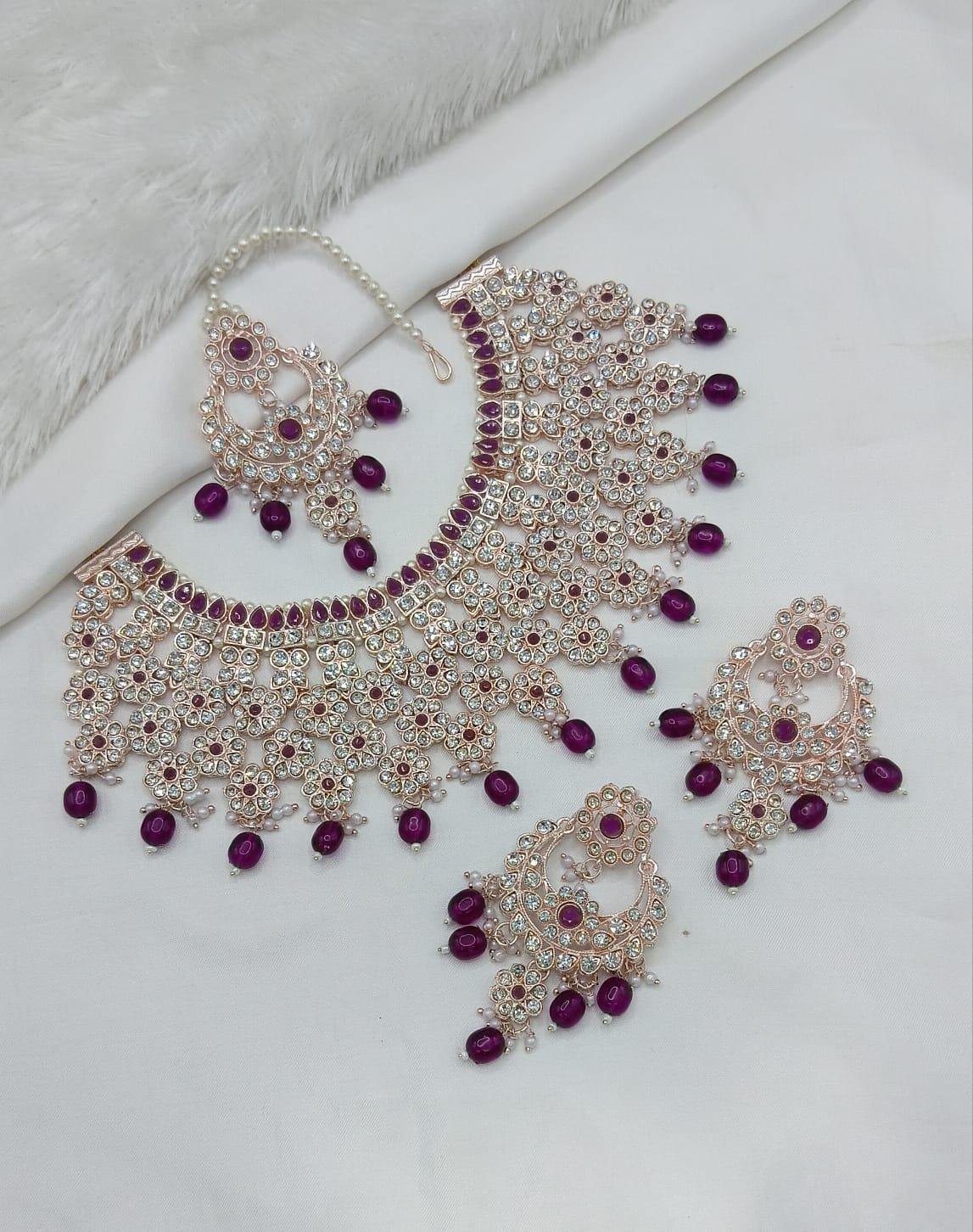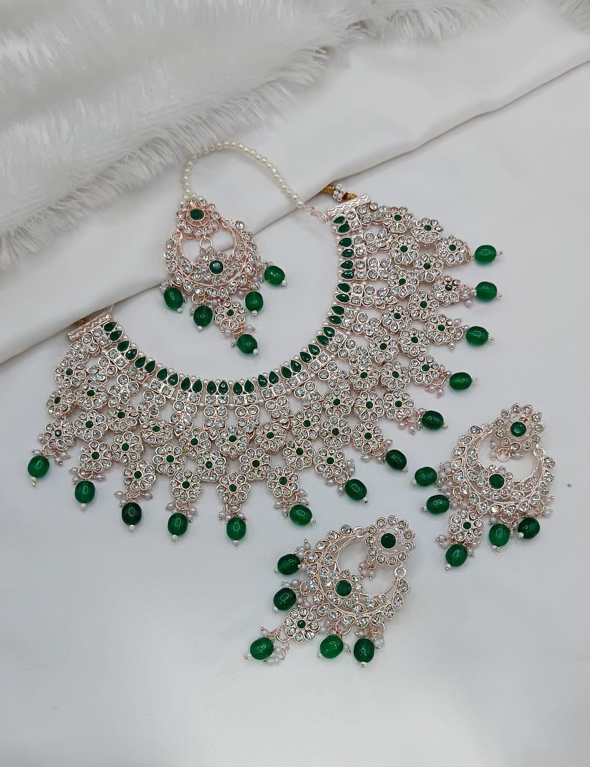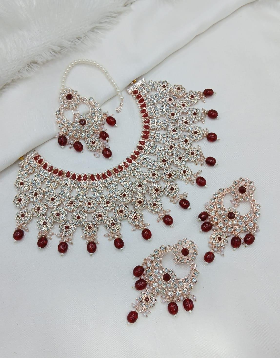 - Paired with matching earrings and maangtikka.