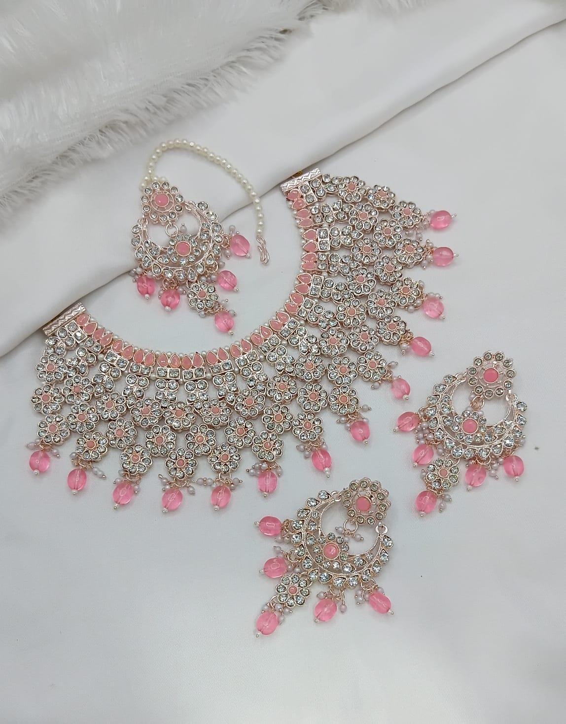 White Colour Rose Gold Finish Necklace Set With Stone And Pearl Work
