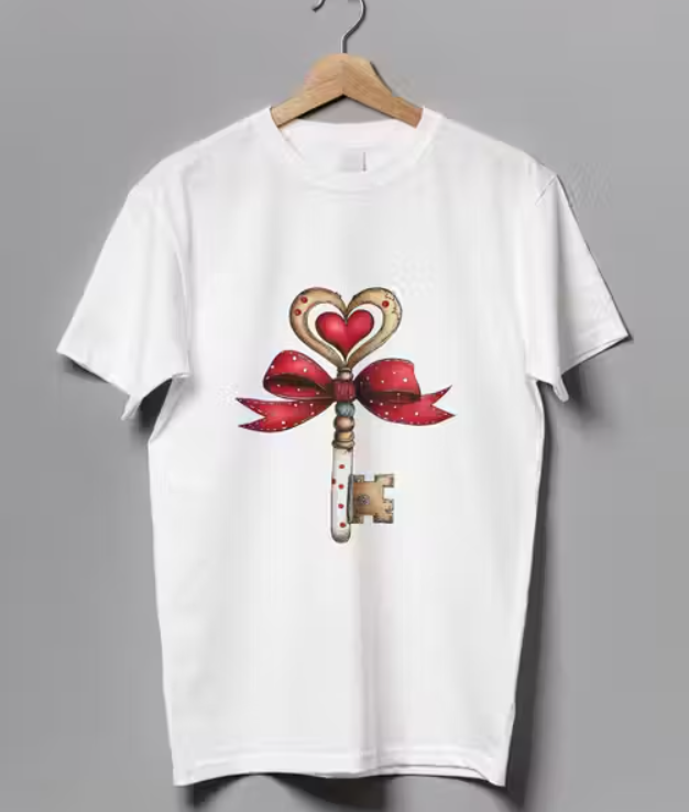 White Heart Key with Red Bow Printed T-Shirt | Love Theme Casual Round Neck Tee white printed t shirt, heart key print t shirt, love theme t shirt, red bow design t shirt, casual round neck tee, aesthetic t shirt, daily wear t shirt, minimalist graphic t shirt, valentine theme t shirt, trendy print t shirt