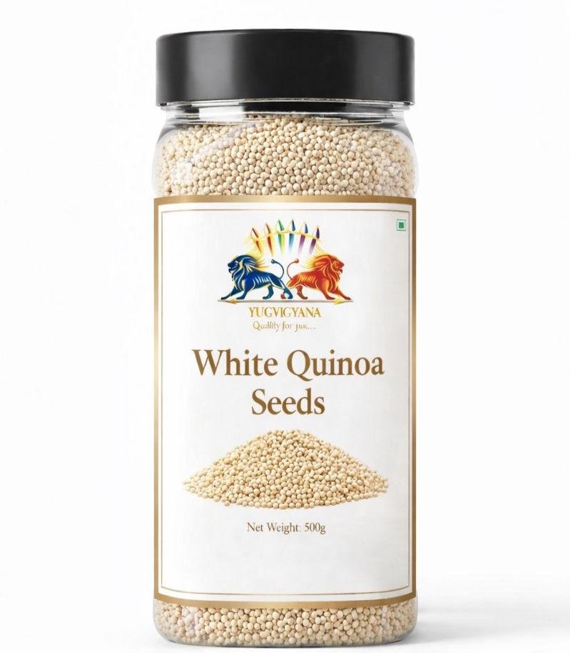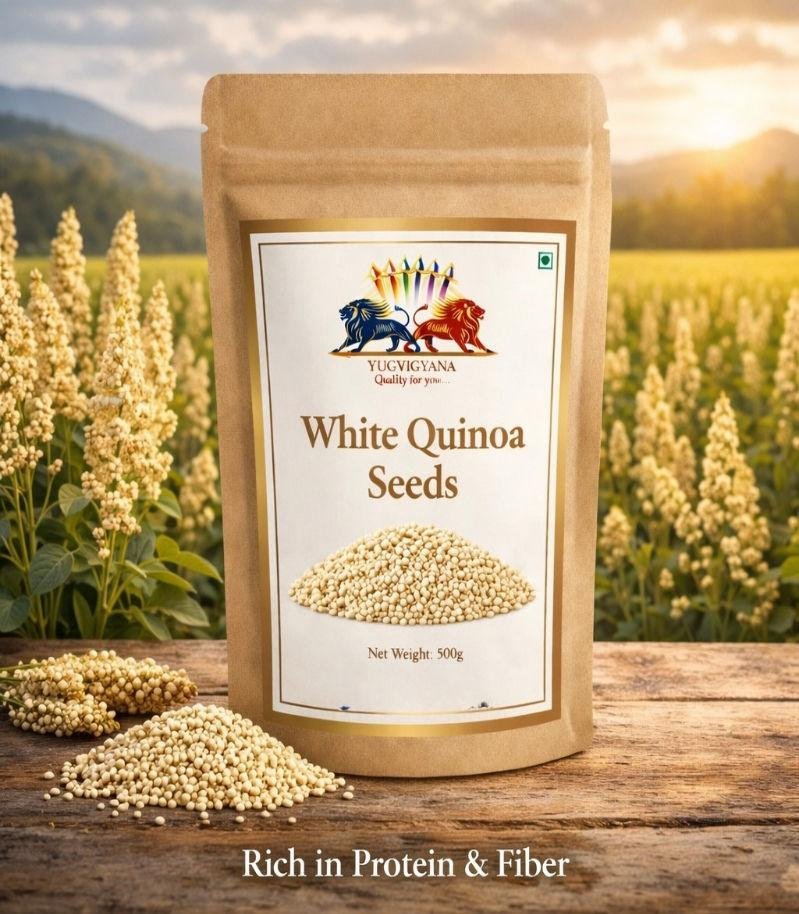 Item Name: White Quinoa Seeds - Premium Superfood Brand: YUGVIGYANA Form: Whole Seeds Grade: Premium Quality - A Grade Diet Type: Vegetarian, Gluten-Free Packaging: Food-grade resealable pouch with moisture barrier Net Weight: 250g / 500g / 1000g (Multiple variants) Bulk Pack: 5 Kg & 10 Kg available Storage: Store in cool, dry place away from direct sunlight Certification: FSSAI Approved