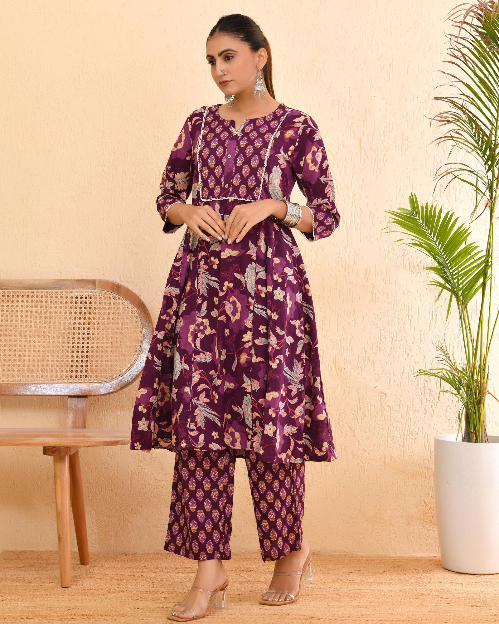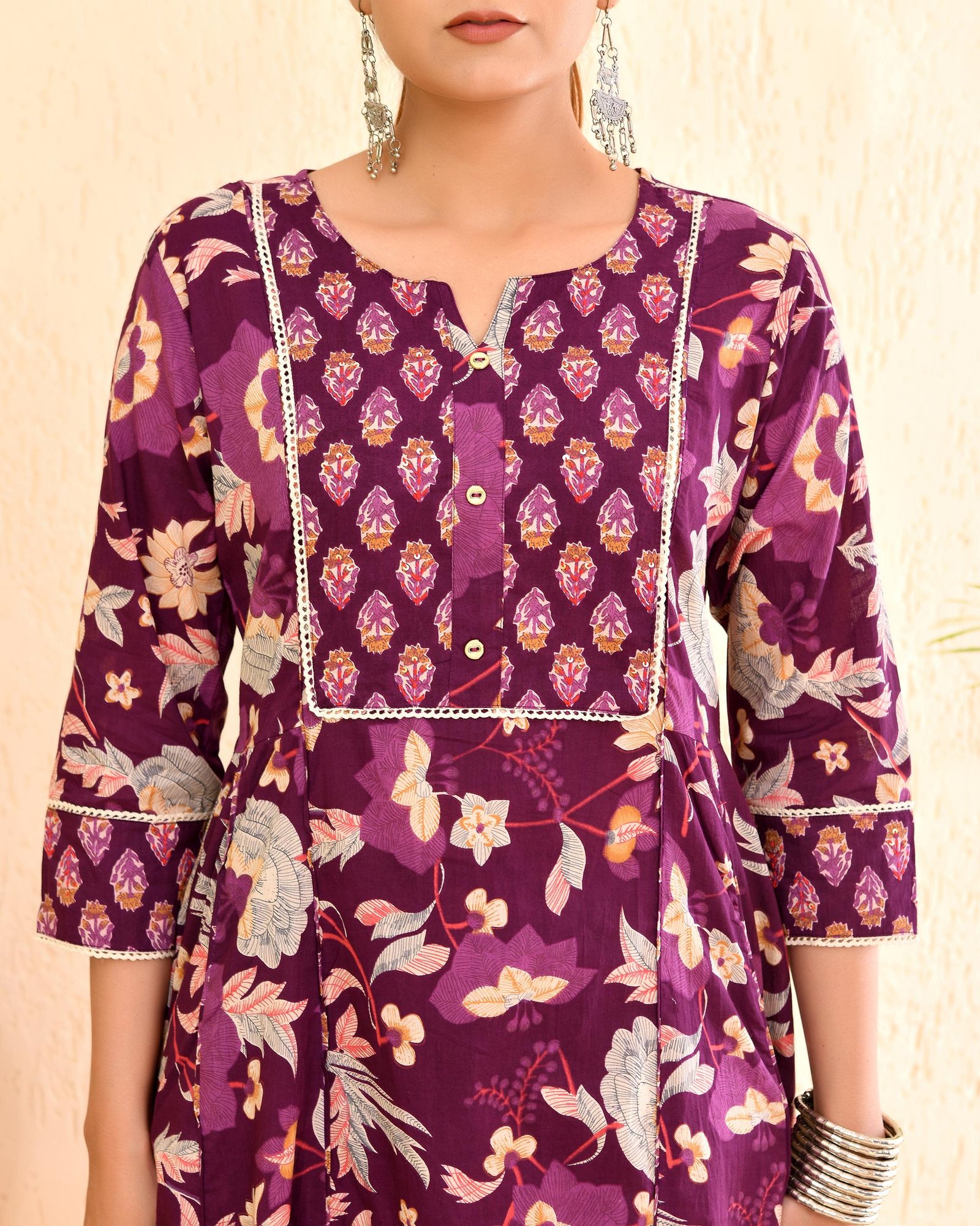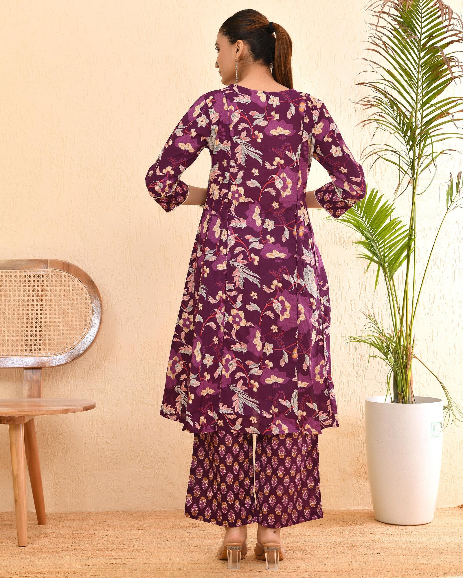 π Women Cotton Floral Printed Anarkali Kurta with Palazzo Set β Purple