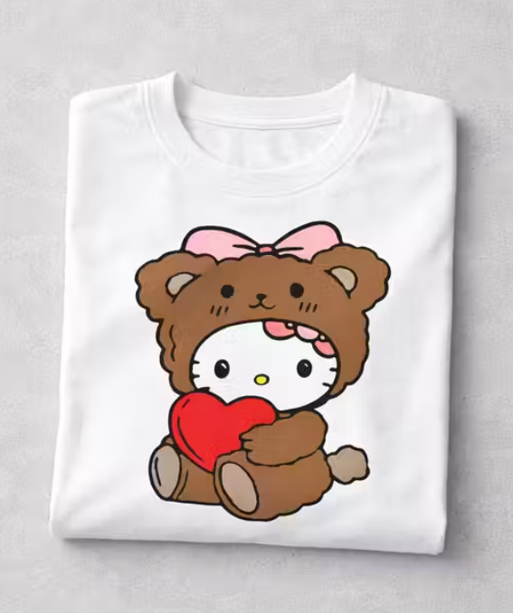 Women White Cotton Printed T-Shirt Cute Teddy Bear Heart Design