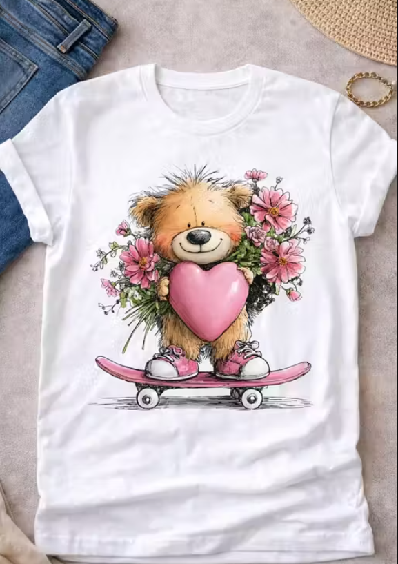 Women White Cotton Printed T-Shirt Cute Teddy Bear Skateboard Heart Design Casual Wear Stylish Girls Top Women T-Shirt, White Cotton T-Shirt, Teddy Bear Print T-Shirt, Skateboard Teddy T-Shirt, Heart Design T-Shirt, Cute Printed T-Shirt for Women, Casual Girls Top, Cartoon Print T-Shirt, Stylish Women Wear