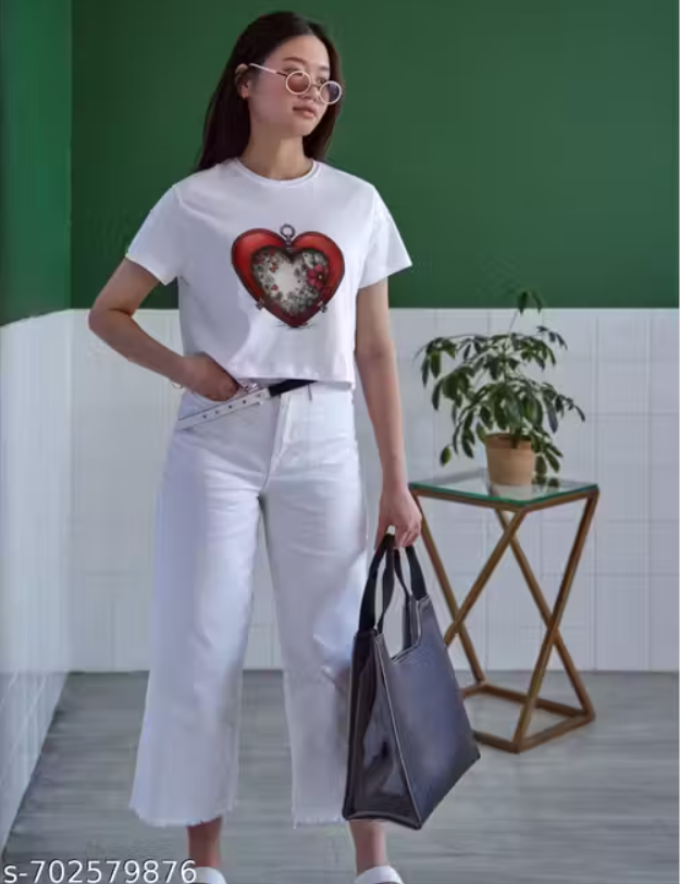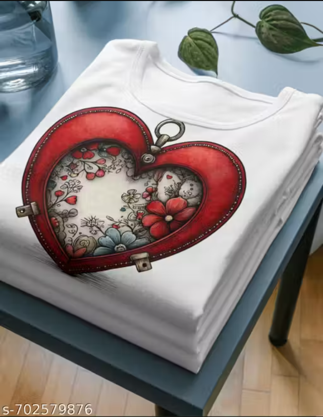 Women White Cotton Printed T-Shirt Heart Lock Floral Design Casual Wear Stylish Girls Top