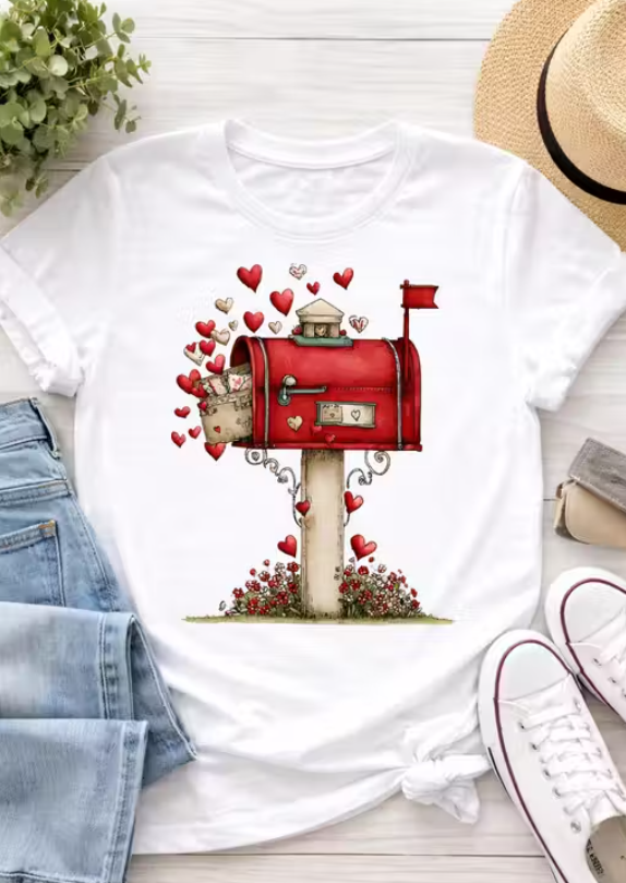 Women White Cotton Printed T-Shirt Love Letter Mailbox Heart Design Casual Wear Stylish Girls Top Women T-Shirt, White Cotton T-Shirt, Love Print T-Shirt, Mailbox Heart T-Shirt, Love Letter Design T-Shirt, Cute Printed T-Shirt for Women, Casual Girls Top, Valentine T-Shirt, Stylish Women Wear