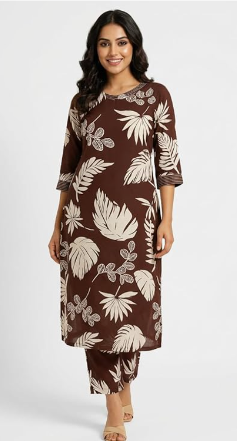 - STYLISH DESIGN: Women's brown kurta with pant set featuring an elegant tropical leaf and floral print pattern in cream and beige tones for a contemporary ethnic look