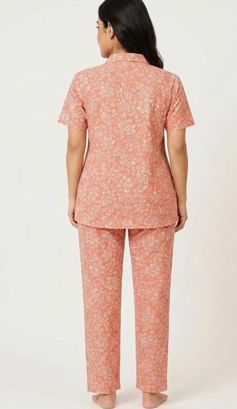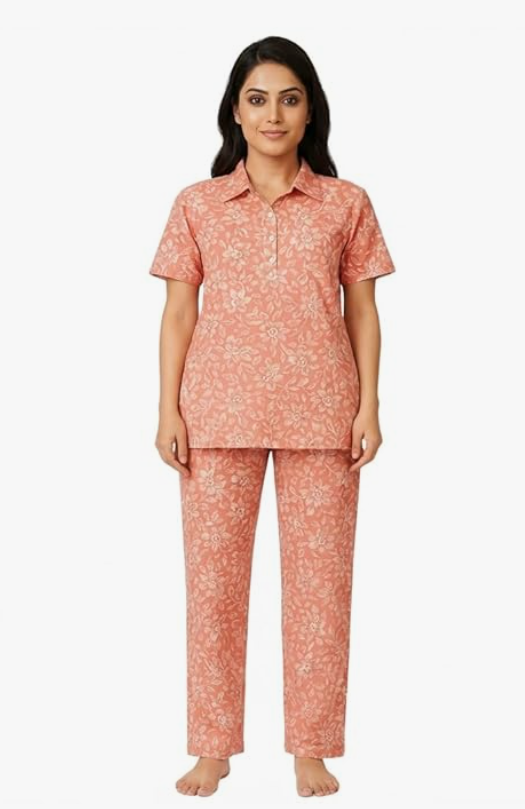 STYLEGENIXSTYLEGENIX Women's Cotton Nightwear Set, Coral Floral Print, Short Sleeve Polo Collar Top with Pajama, Comfortable Loungewear