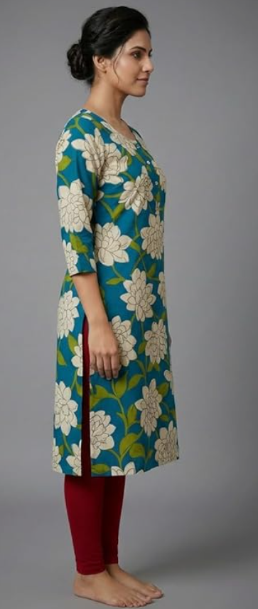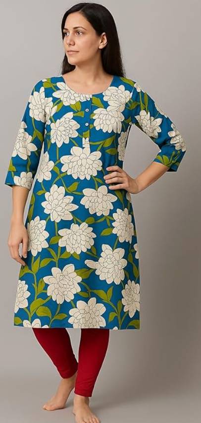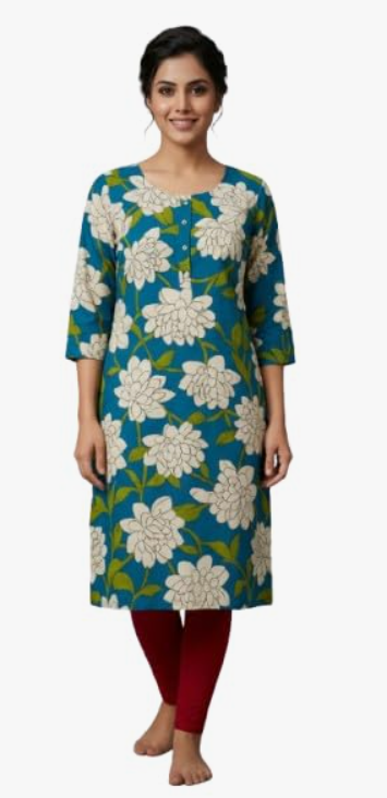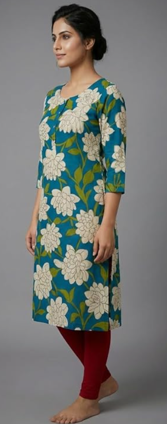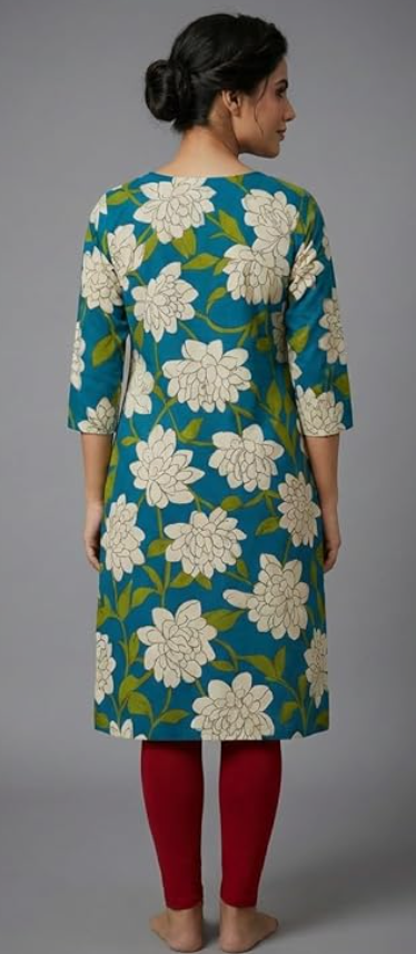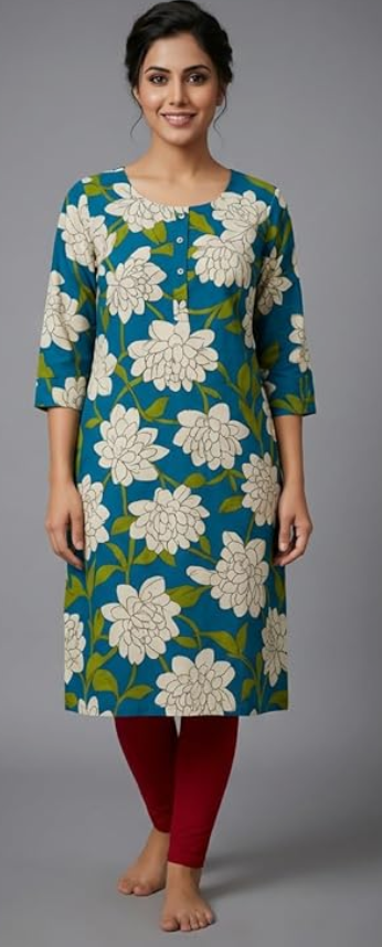 - STYLE & DESIGN: Women's kurta featuring an elegant floral print with white flowers on a vibrant teal blue background, perfect for casual and semi-formal occasions