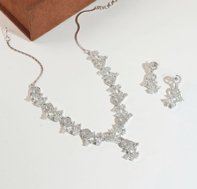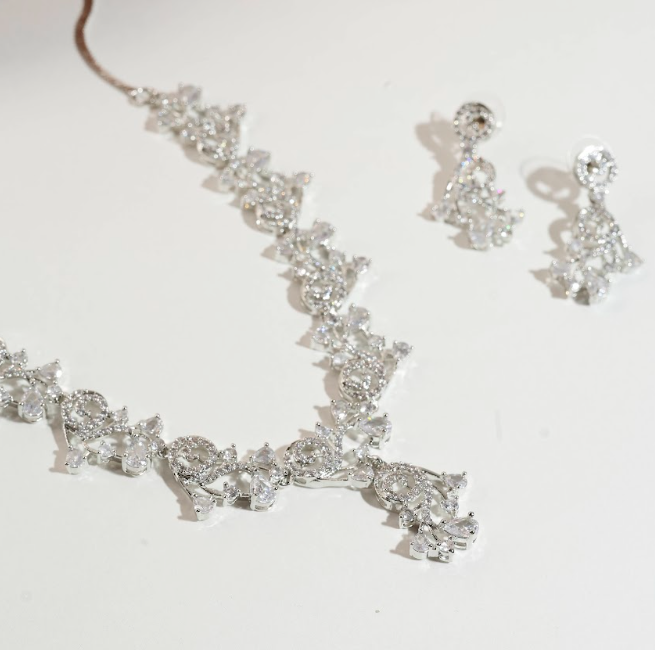- COMPLETE SET: Includes a stunning necklace and matching earrings, beautifully designed with clear cubic zirconia stones in mixed cut for maximum brilliance.