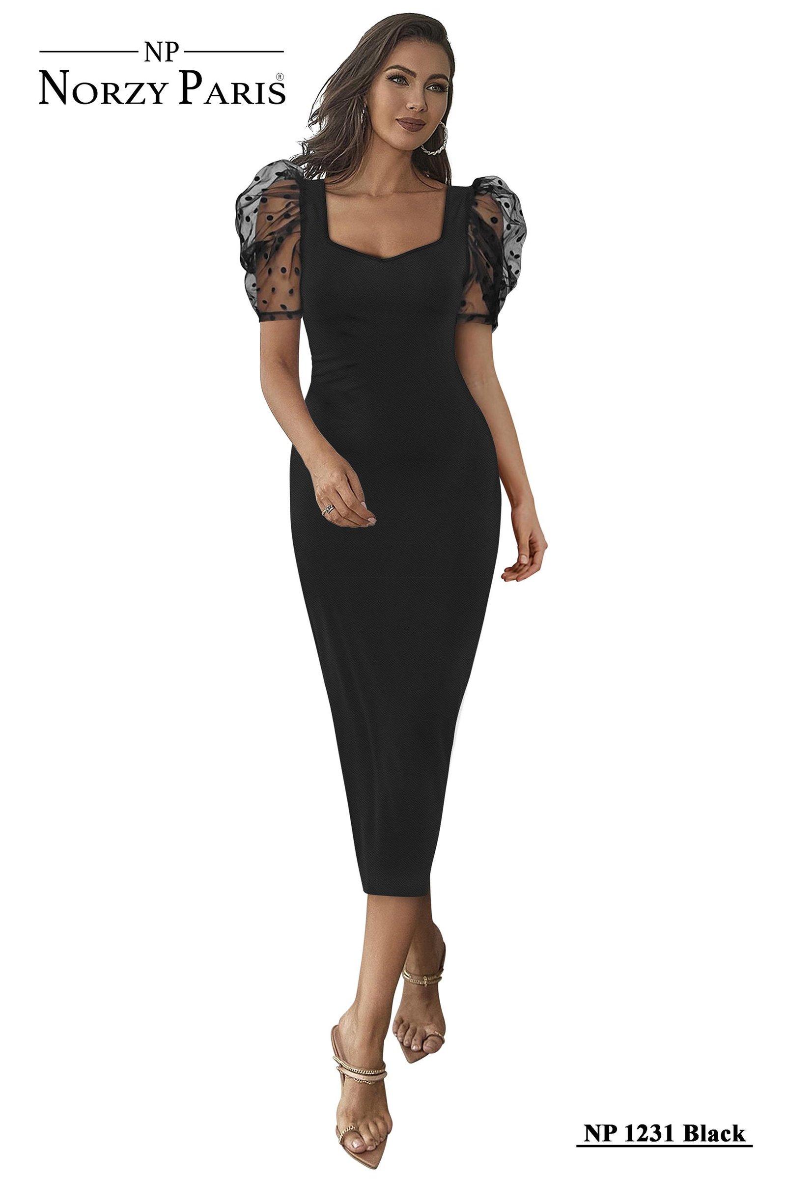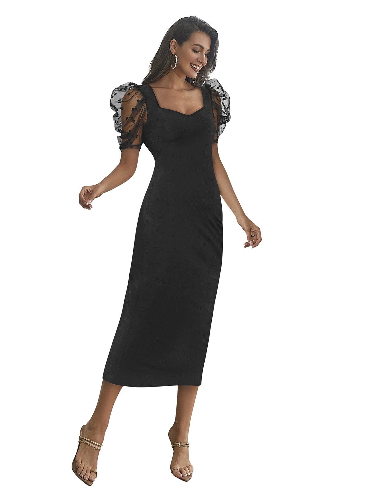Women's Midi Length Sheer Polka Dot Puff Sleeves Square Neck Slim Fit Black