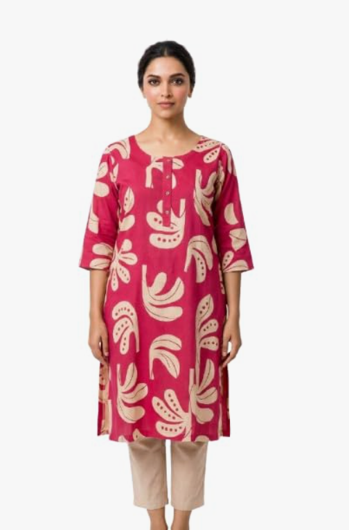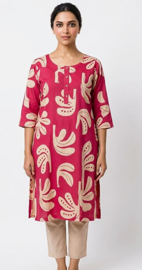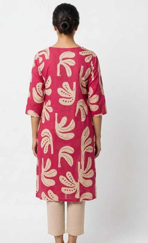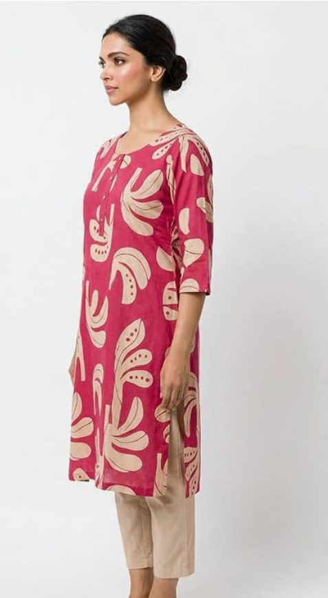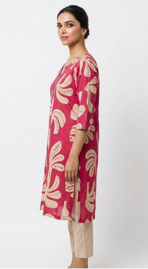 - FABRIC & DESIGN: Women's printed kurti crafted from comfortable cotton fabric featuring an elegant beige floral print on a vibrant pink base with a relaxed tunic silhouette