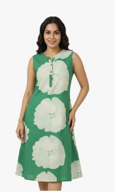 STYLEGENIXSTYLEGENIX Women's Sleeveless A-Line Dress, Green with Floral Print, Knee Length, Cotton Blend