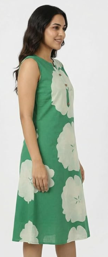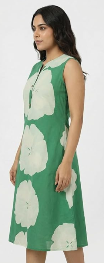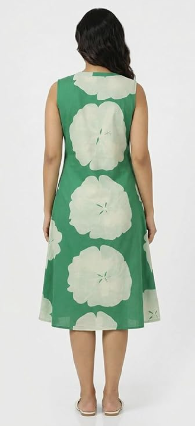 - STYLISH DESIGN: Women's sleeveless A-line dress featuring a vibrant green base with large cream floral print for a fresh, contemporary look