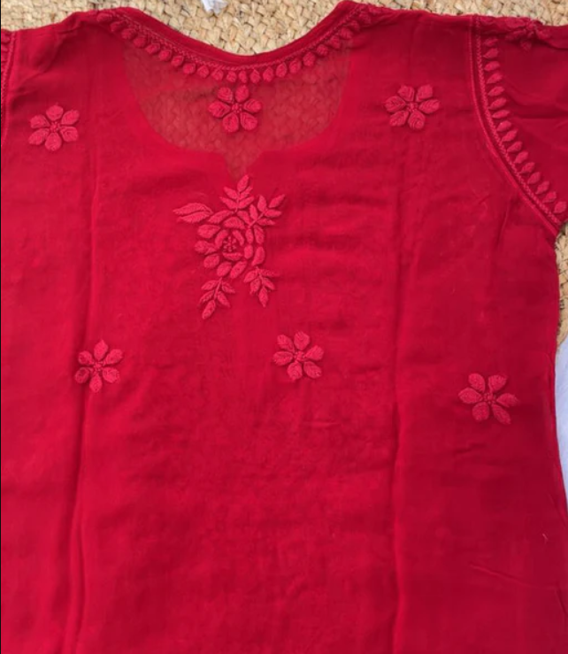 YATI Red Pure Viscose Chikankari 3D Emboss 4pcs Set