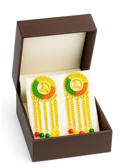 Make a bold and luxurious style statement with these Yellow Gold-Plated Mercedes-Benz Logo Chandelier Earrings. Designed for those who love iconic fashion, these earrings feature the classic Mercedes-Benz logo beautifully crafted into an elegant chandelier silhouette.
