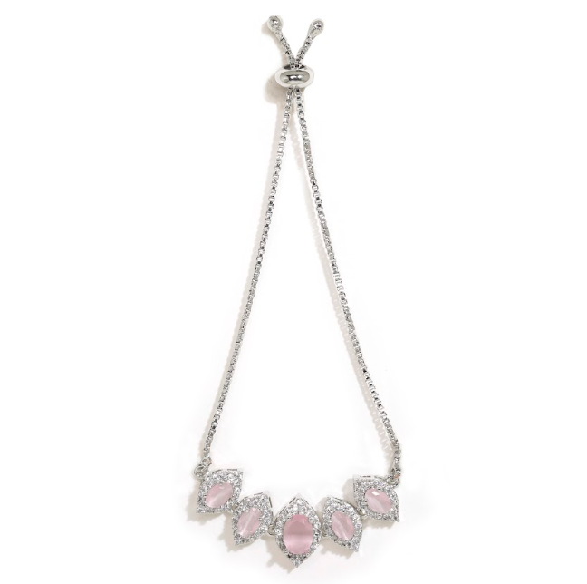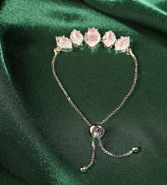 Elegant piece of designer rhodium plated adjustable chain bracelet adorned with light pink stone. Gift this to your girlfriend, wife or sister and she will be delighted. Very elegant and classy piece of bracelet for special occasions.